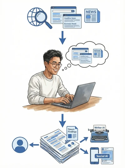 How it works Tell Timo what to watch: competitors, market prices, or industry trends. He continuously scans the web, filtering for exactly what is relevant to your business.